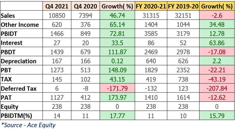 The sales for the March 2021 quarter moved up 46.74% to Rs. 10849.70 millions as compared to Rs. 7394.00 millions during the corresponding quarter last year. Net Profit witnessed a 173.97% growth almost the double from Rs. 411.50 millions to Rs. 1127.40  millions  of same quarter last year. Operating Profit saw a handsome growth to 1466.30 millions from 848.50 millions in the quarter ended March 2021.