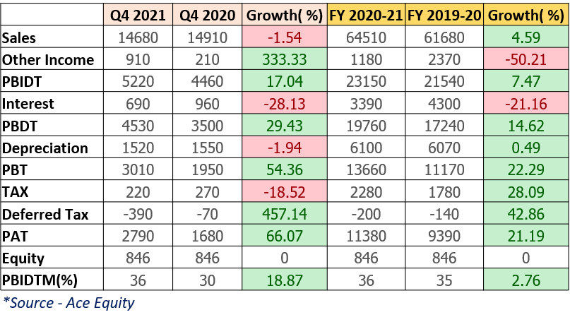 The revenue declined to Rs. 14680.00 millions for the quarter ended March 2021 as compared to Rs. 14910.00 millions during the corresponding quarter last year. The Profit for the quarter ended March 2021 of Rs. 2790.00 millions grew by 66.07% from Rs. 1680.00 millions. The company reported a good operating profit of 5220.00 millions compared to 4460.00 millions of corresponding previous quarter.